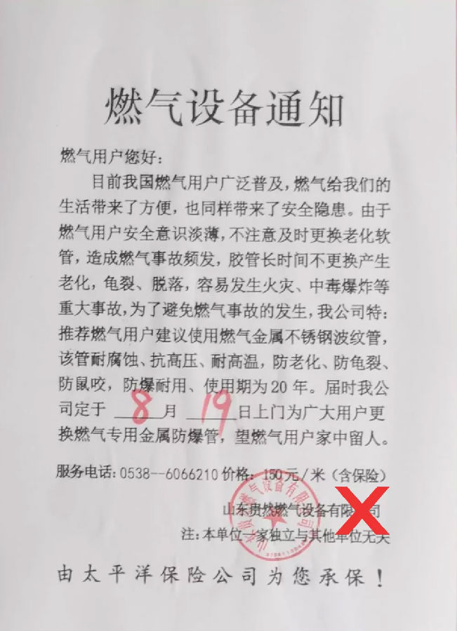 安泰燃?xì)夤驹诖肃嵵芈暶鳎涸谖夜舅爡^(qū)域內(nèi)未開展此類業(yè)務(wù),且未委派任何單位開展此類業(yè)務(wù)。請廣大燃?xì)庥脩糇屑?xì)辨別,謹(jǐn)防上當(dāng)受騙購買不合格產(chǎn)品,影響用氣安全。
