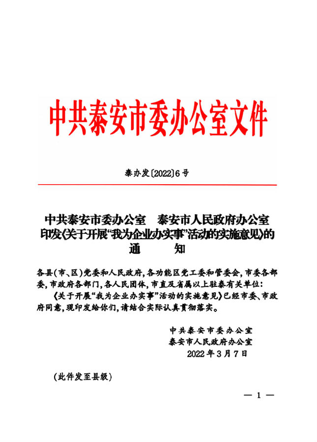 中共泰安市委辦公室泰安市人民政府辦公室印發(fā)關(guān)于開(kāi)展我為企業(yè)辦實(shí)事活動(dòng)的實(shí)施意見(jiàn)的通 知